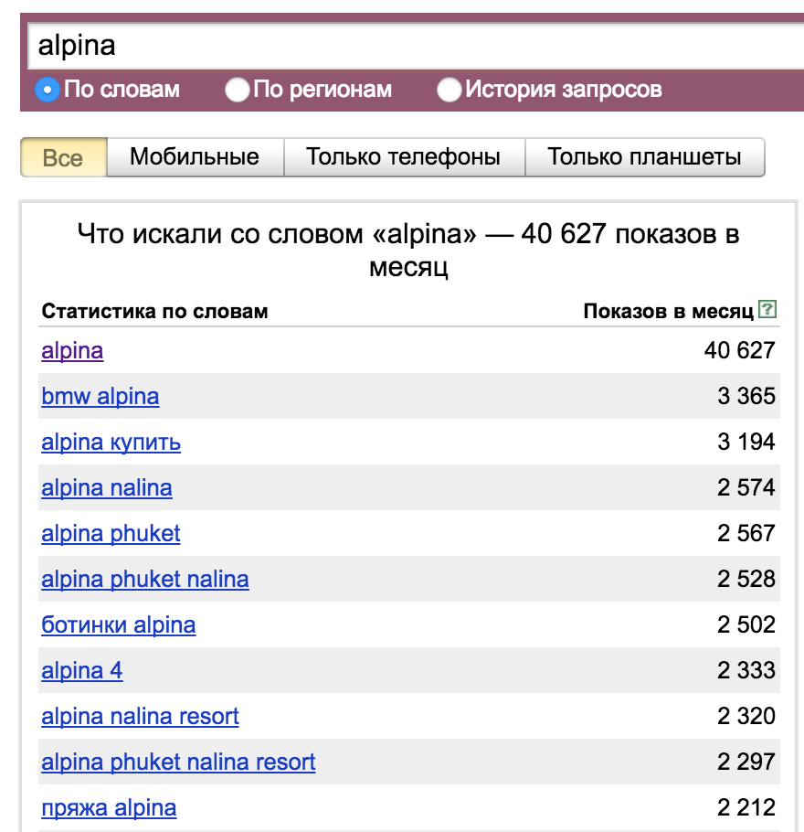 Как это применимо на практике? Когда мы начинаем разбор какой-то новой ниши, или сбор семантики для сайта, мы всегда начинаем с массового парсинга запросов. Запросы мы эти получаем из вордстата, подсказок, вебмастера, метрики или баз. При любом методе сбора, мы всегда будем получать как соответствующие нашему сайту запросы, так и нет. Рассмотрим на достаточно хардокрном примере. Допустим, у нас есть автопортал, и мы хотим сделать раздел про BMW ALPINA. Мы обращаемся к вордстату, подавая к нему запросы alpina и альпина. И получаем вот такой интересный результат: