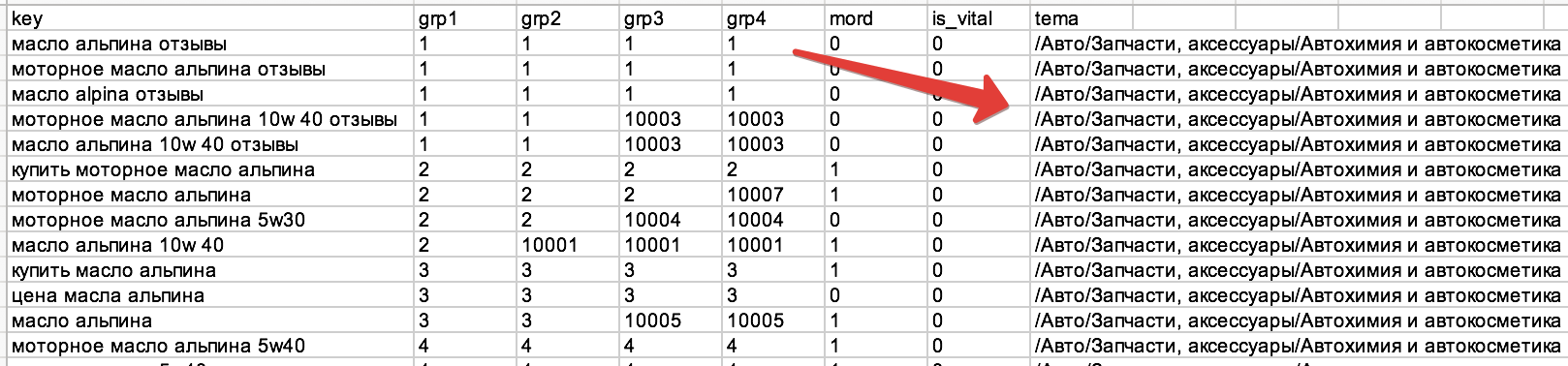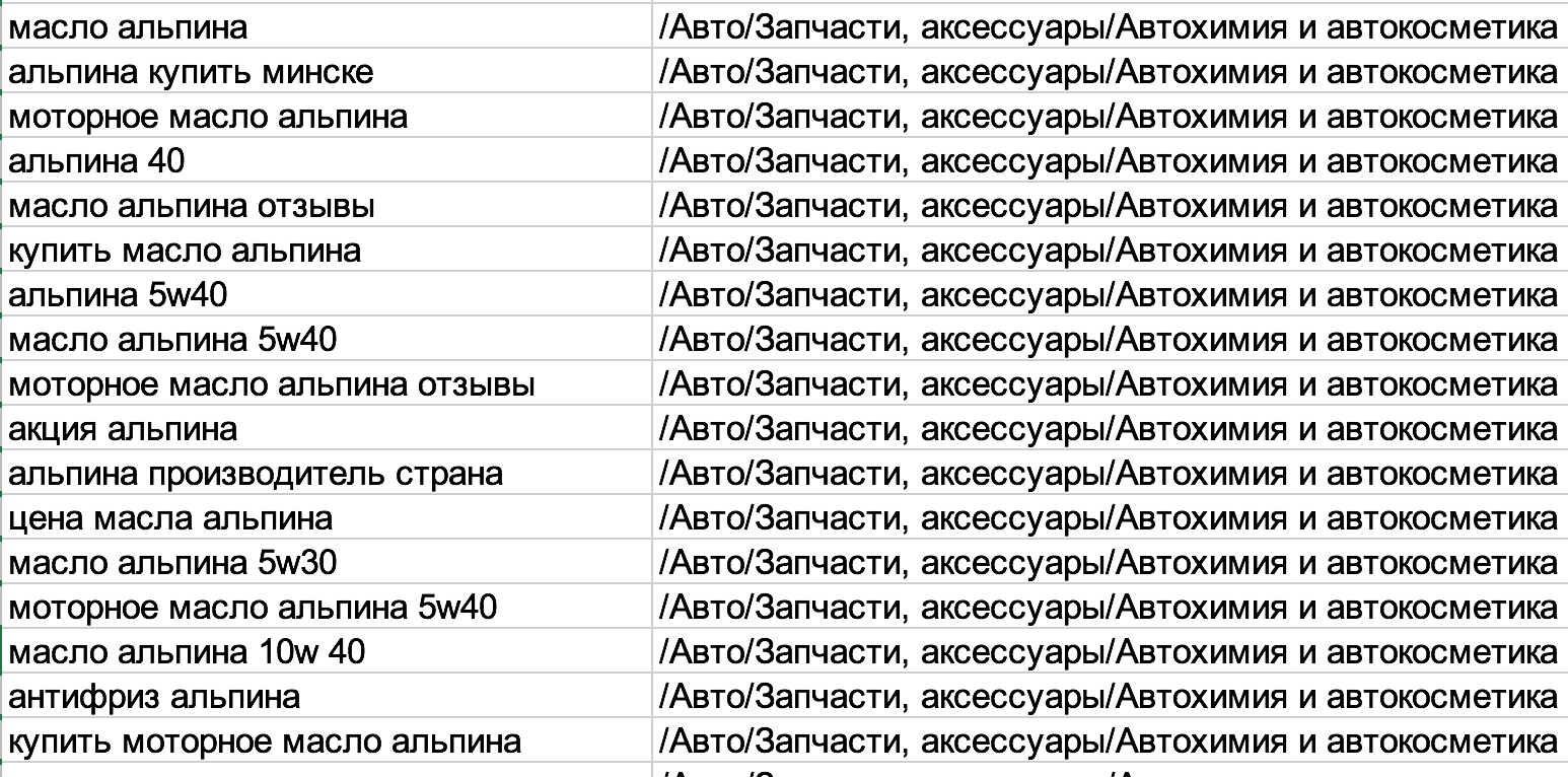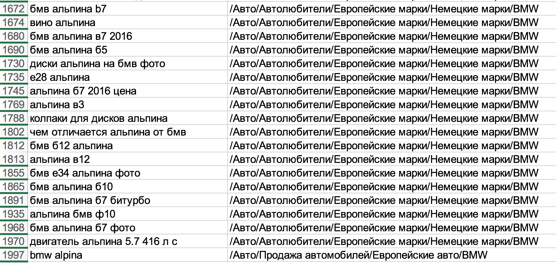 Оказывается, помимо BMW, alpina может быть чем угодно. Ботинками, отелем, даже пряжей. Посмотрим, как с такой задачей справится классификатор. Загружаем в него спарсенные запросы, фильтруем по вхождению "BMW" в тематике и получаем вот такой список: