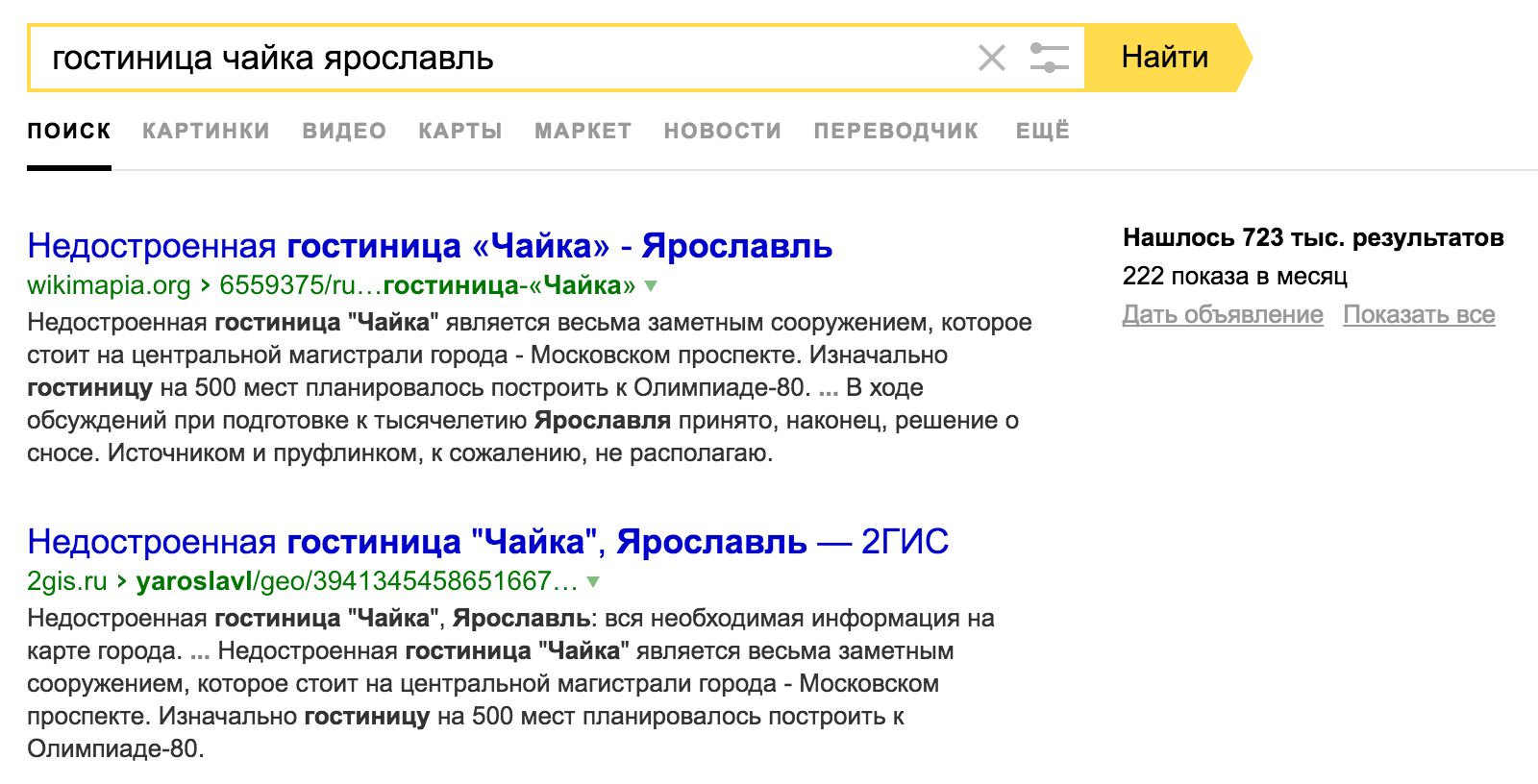 Ещё одно применение - это почистить текущее ядро. Причем классификатор справляется даже с теми случаями, где человек запрос оставит. Например, если мы продвигаем сайт про гостиницы, то казалось бы что криминального в запросе "гостиница чайка ярославль"? Однако, классификатор упрямо относит его в "/Бизнес/Недвижимость/Аналитика". Почему так происходит? Давайте заглянем в выдачу: