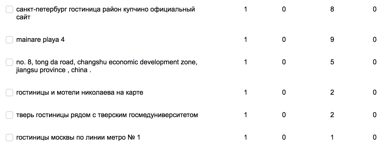 Допустим, вы получили большой массив запросов из сильно зашумленного источника. Это может быть вебмастер, метрика или базы запросов миллиардного размера. И вам необходимо быстро и с минимальными затратами понять - какие запросы можно рассматривать, а какие следует отбросить. Вот пример реальных запросов, которые показываются в вебмастере: