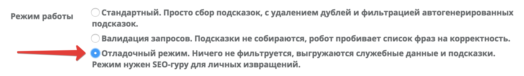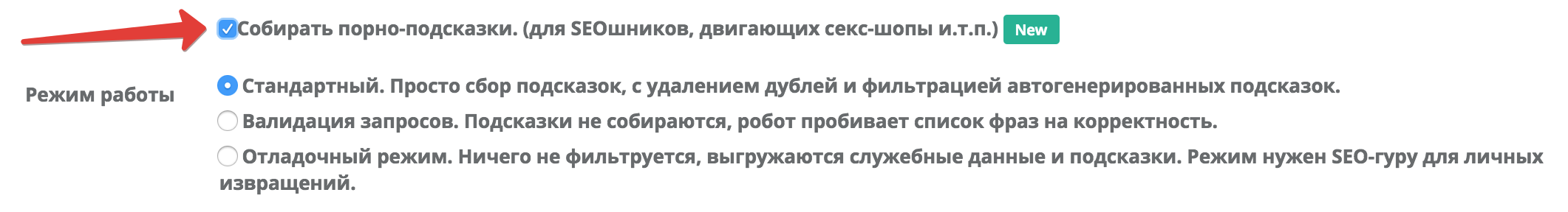 Еще одно применение - разделение семантики на "адалт" и "обычные" запросы. Адалт-запросы, как уже упомяналось ранее, имеют уникальный тип Pb. Ставите галочку сбора порно-подсказок и выбираете "отладочный режим". Все подсказки будут разделены: