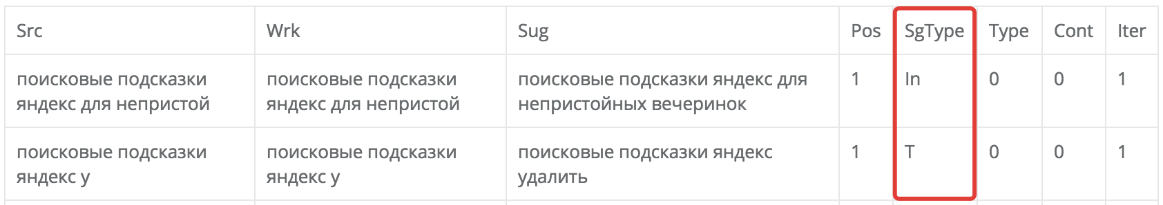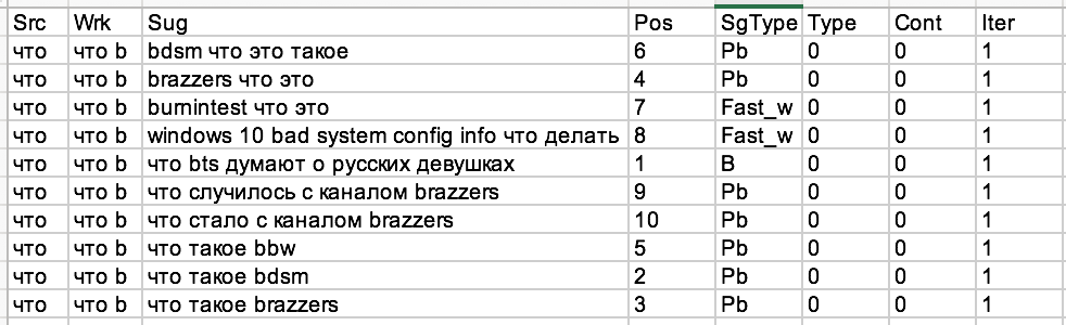 Важно, что при этом вы получаете микс подсказок - как непристойные, так и вполне обычные. Поэтому, все равно потом потребуется их как-то разделять. Это можно решить на этапе кластеризации по топу, или чуть раньше, если использовать расширенный режим и выделять подсказки с sgtype "Pb".