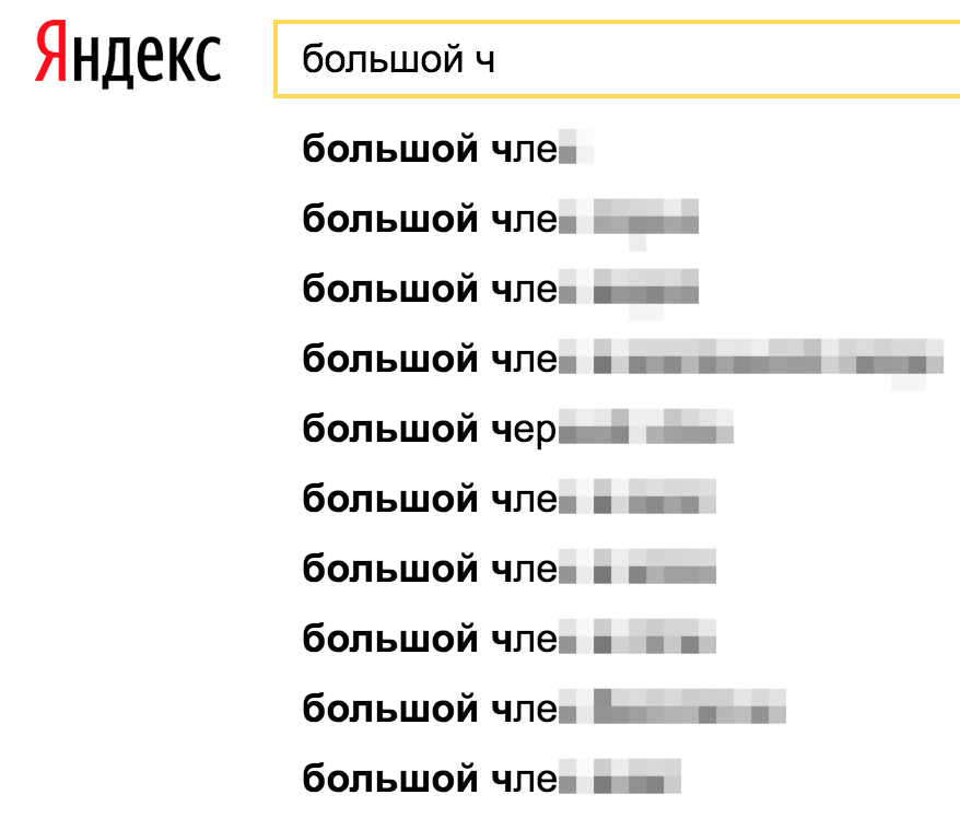 И закономерно не видите никаких подсказок. Однако, есть простой лайфхак, который позволяет получать подсказки с непристойностями. Нужно сперва подать постыдный запрос в Яндекс, а затем с полученного серпа искать интересующие вас подсказки: