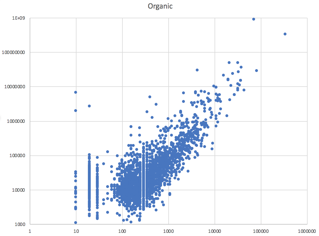 Что тут яйцо, а что курица - неясно. Ведь общий трафик, тайп-ин, органика и даже реферрал отлично скоррелированы между собой. Мы можем лишь попытаться сделать оценку, посмотрев корреляцию между ИКС и общим трафиком для сайтов, чей type-in менее 10% и не должен оказывать сильного влияния на результат. Смотрим: