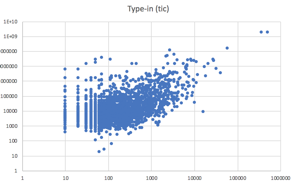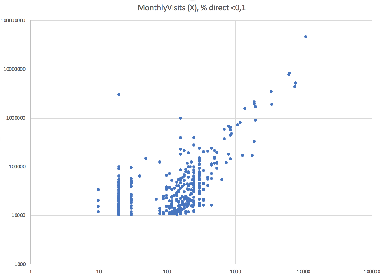 Оп! Таких сайтов немного, но корреляция хорошо видна. А это означает, что с большой степенью вероятности ИКС скоррелирован в первую очередь с общим трафиком, а лишь во вторую - с type-in.