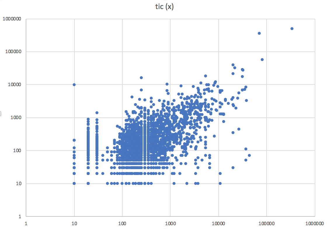 Что мы видим? Безусловно, некоторая корреляция между ТИц и ИКС имеет место быть. Но, виден также существенный разброс значений. Ясно что метрики очень разные, хотя и имеют корреляцию.