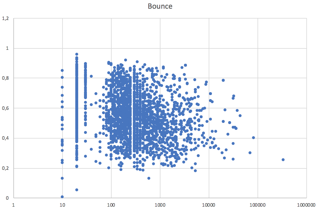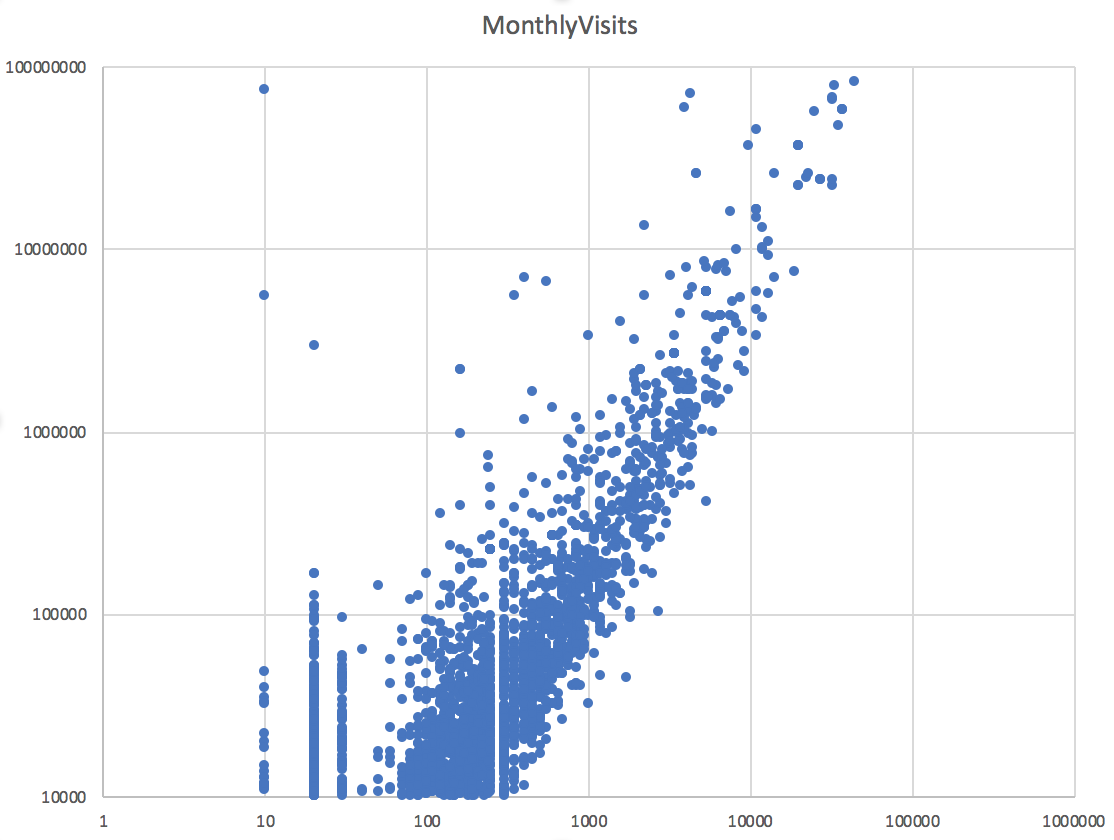 Итого, если ИКС отлично коррелирует с прямым трафиком (type-in) и плохо - с его долей. Может быть... он просто связан с общим трафиком на сайт? Смотрим...