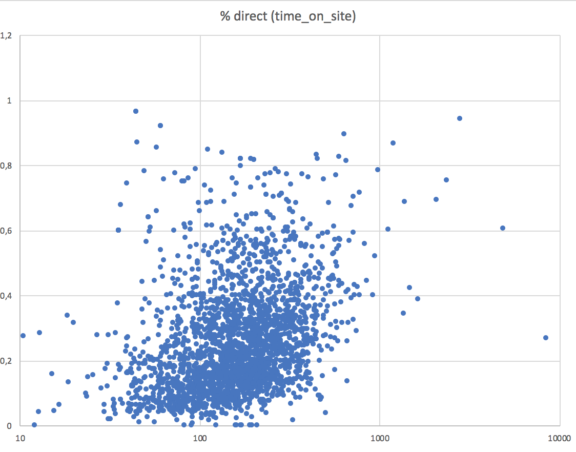 Здесь всё довольно ожидаемо. Разброс большой (ведь сайты очень разные), но явно прослеживается корреляция между долей тайп-ина и временем на сайте.