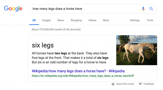 Может ли BERT как Палех/Королев находить документы, релевантные запросу? Да, конечно. И даже более того - BERT может находить конкретное место в тексте, в котором содержится ответ на поисковый запрос. Эта опция уже активно применяется при формировании featured snippet. Однако, тут же проявляется и фундаментальный недостаток текущего уровня обработки естественного языка. Алгоритм может найти ответ в тексте, но не может понять правильный он, ошибочный или шуточный. Наглядно иллюстрирует это один из featured snippet, быстро ставший мемом: