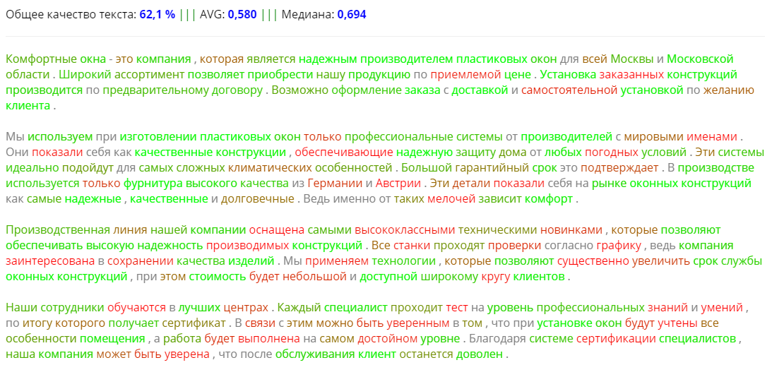 Помимо этого выводятся общие параметры текста - общее качество текста, среднее и медиана.