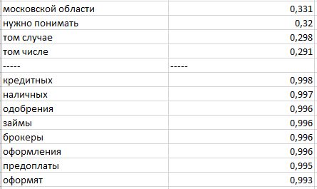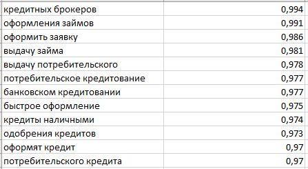 Для слова во втором столбце выводится уровень его соответствия тематике (может быть от 0,5 до 1. Чем больше - тем лучше).